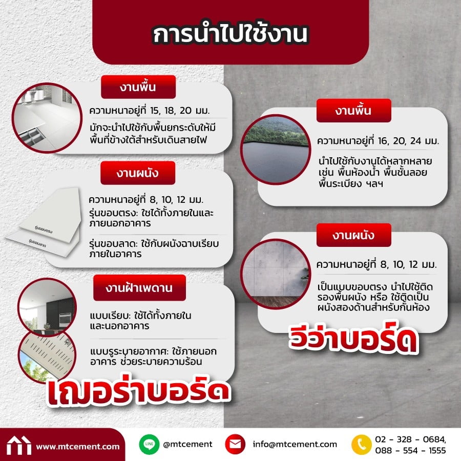 สำหรับเฌอร่าบอร์ดกับวีว่าบอร์ด สามารถนำไปก่อสร้างได้ทั้งภายใน และภายนอกอาคาร โดยจะมีการผลิตความหนาของบอร์ดที่ไม่เหมือนกัน เพื่อจะได้นำไปใช้ให้เหมาะสมกับงานประเภทนั้นๆ คือ