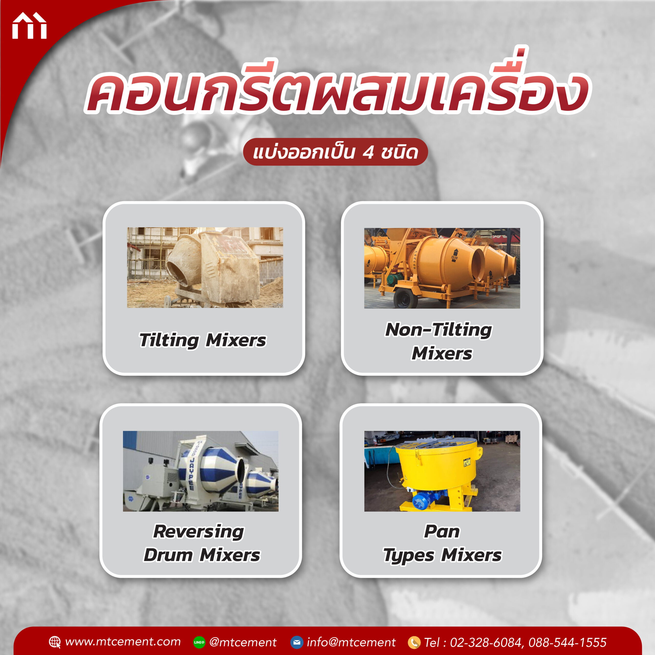 - Tilting Mixers ลักษณะของถังจะคล้ายกับทรงกรวย เพราะที่ฐานจะกว้าง ส่วนปากถังจะแคบ ในถังมีใบพัดอยู่ข้างใน คอยผสมส่วนต่างๆ เข้าด้วยกัน โดยมีมือหมุนอยู่ที่ด้านข้าง เอาไว้สำหรับปรับองศาถัง เพื่อเทปูนใส่กระบะหรือบนพื้นที่ต้องใช้ปูน